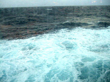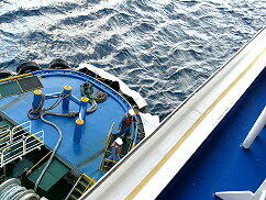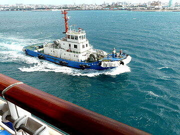 本船はあとすざりをして180度回頭し港外へ向かう。近くにタグボートが付き添い併走する。パイロット船が来ないと思 ったら港外でこのタグボートが無事パイロットを拾う。荒れた海での見事な離れ業に、それを見ていた船客から思わず拍 手が起きました。