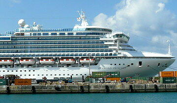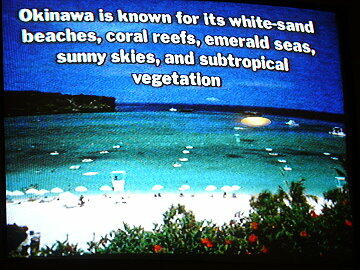 明日の沖縄上陸のために日本人以外の入国手続きが大変な様子である。我々がシアターでミュージカルを見ていると きでもシアター横では延々と入国手続きを行っていた。こちらは自国なのでなにも手続きはなし。現在、政府は外国観光 客を呼び込もうと躍起となっているようだが、このような面倒な手続きある限り、観光客の集客は望み薄である。