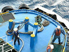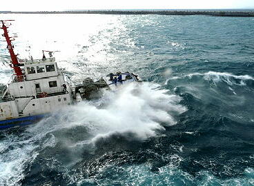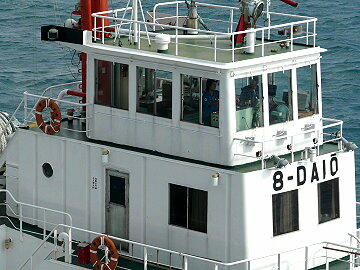 外海に出ると波が高く、タグボートの船首が波で見えなくなるほどでした