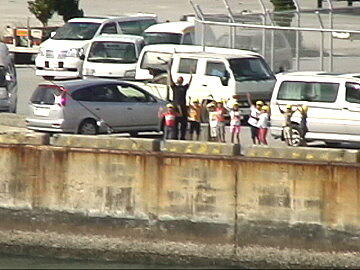 埠頭の反対側に回ってチビッコ達が最後の挨拶 いつも間にかにタグボートが近寄ってきました