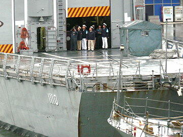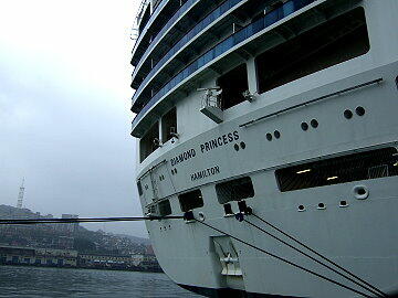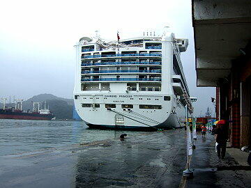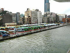 本船は快速を生かして340海里を一晩で駆け抜け、8時には基隆港に到着。海軍基地のすぐ隣に接岸した。しば し、接岸風景を見物する。今回の台湾オプショナルツアーの参加者は非常に多いようで、岸壁を見るとバスが50台余も 停まっていた。一台40人見当で計算すると約2000人近くの乗客が台北方面ツアーへ出かけたようだ。