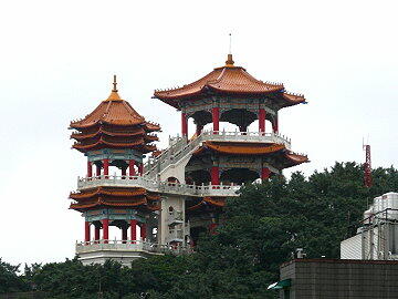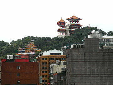 タグボートが随伴する 港から見える中正公園の観音像