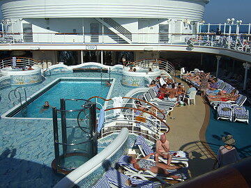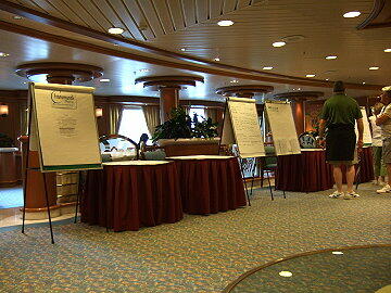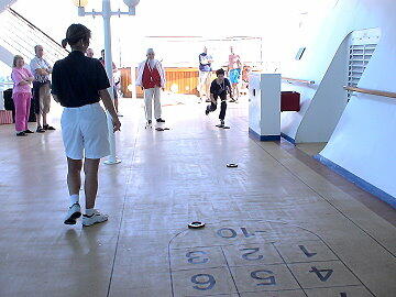 11時からシャッフルボードの大会があったので夫婦で参加する。おかあちゃんは一回戦で敗退し、私は2回戦で敗 退、しかし、あのじじいには負けたくなかった・・・・・・。今日、船室に届いた手紙に船長主催のカクテルパーティ参加の招 待状があった。これはリピーターのみ招待されるらしい。そういえばシップカードの色も、リピーターにはゴールドに変えて いるようだ。