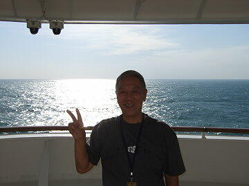 朝5時半に起床。昨日までとは打って変わってようやく静穏な航海日和となる。日が高くなるにつれてサンデッキには 続々と人が集まり、日向ぼっこが始まった。気温は25度程度であるが、さすが北回帰線を越えると太陽の角度が北海 道とは格段に違い、高い高度まで上がる。11月にこのくらいの高度があれば一年中夏というのもうなずける。