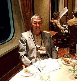本日のディナーは一回目のフォーマルである。おかあちゃんは15時頃から着物に着替えていた。今回の船旅ではた だ一人の着物で、中には一緒に写真を撮らせてくれとという船客もいたりして、皆さんから注目されていたようだ。