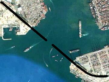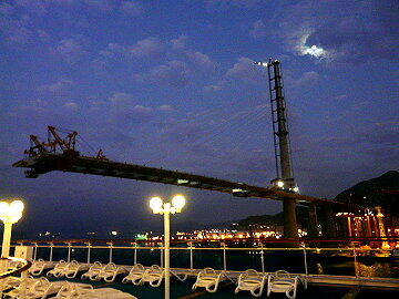 本船の高さ(水面上)は54mなので完成しても通過できそうであるが、通過を見ていると 何か橋にぶつかりそうな気がした。