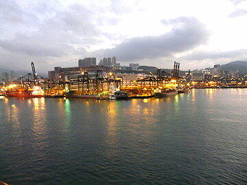 5時に目が覚めると本船はすでに香港の西博寮海峡に入っていた。本船は静かに曲がりくねった航路を取りながら、 当初、予定していたオーシャン・ターミナルには着かないで、モダンターミナルのコンテナ専用ヤードへ接岸する。その ため本来の接岸予定であったオーシャンターミナルまでシャトルバスが出た。