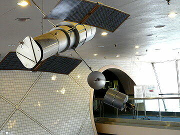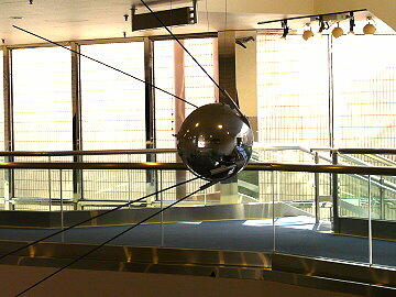 入り口の吹き抜け天井にはいろいろな人工衛星が展示されていました。