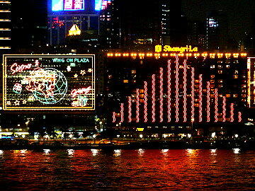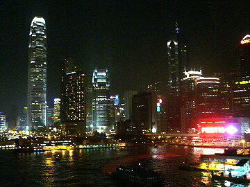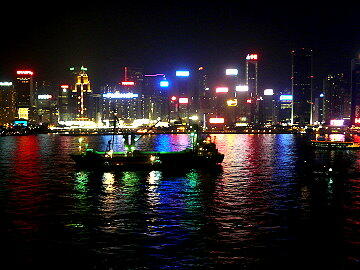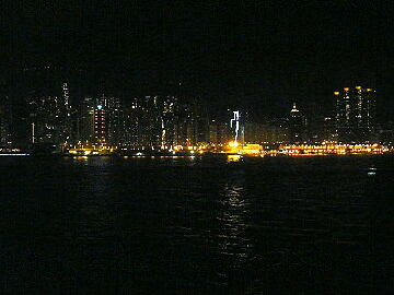 本船は午後7時過ぎにに九龍半島と香港島の間を通過し、ジャンクベイへ向かって再出航し、沖止めとなる。途中船 上から香港島の高層建築物を背景としたシルエットや右舷側の光と音の構成による「シンフォニー・オブ・ライツ」を見 るため早めにデッキに出て席取りをする。この催しは今回の船旅のなかで最高のショーであった。ということで本日のデ ィナーはパス。
