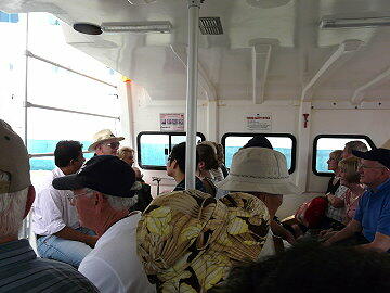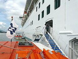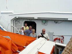 下船客の集合(エクスプローラー) 2カ所からテンダーボートに乗り込みます