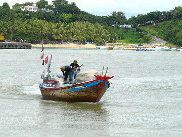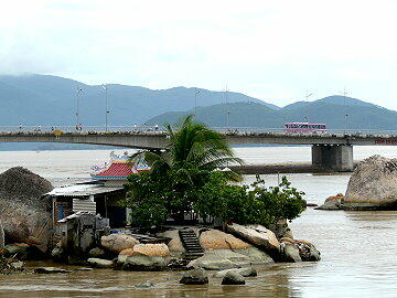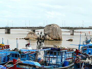 ベトナム,フーカイン,ニャチャン,漁港,風景,。川に突き出た岩は何かいわれがあるらしい。 タクシーの運ちゃんが盛んに説明するのだが、チンプンカンプンでした。