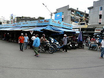 円形状のダム市場の周りには多くの 露店商が営業していて、海産物や金物、日用品などを売るお店が取り巻くように ひしめいています。天秤棒に野菜や果物を乗せて売り歩く人もいて、何だか戦後の闇市みたいな感じがしました。またベ トナム中部最大の漁港を抱えるだけに、海産物はかなり豊富です。日本でお馴染みのスルメらしきものまで売っていた のにはビックリ。
