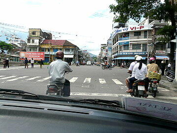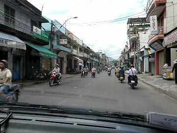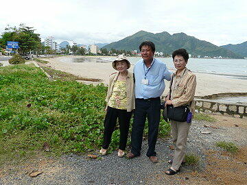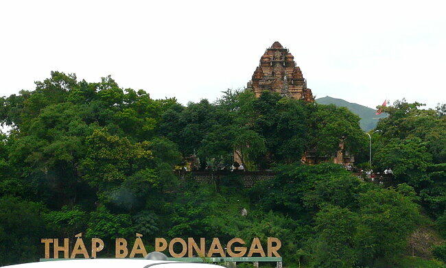 港からニャチャンの「ダム広場」までシャトルバスで向かう。所要時間は10分くらいであった。広場に着くと大変な人だ かりとバイクの多さにビックリ。市内のみどころ5カ所で一時間という約束でタクシーチャーターを依頼。一人5ドルで交渉 するが、なかなか首を縦に振らない。結局7ドルで商談成立(8人乗りなので仕方がない)。さっそく最初にロンソン寺に 行き、次いでボーナガル塔へ向かう。ここでは入場料1ドルを取られたらしい(私は外から眺めただけ)。