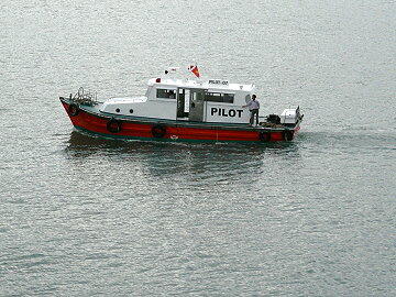 水先人を迎えに来たパイロット船。全員制服姿なのはお国柄か