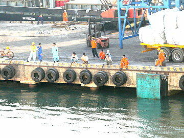 港湾労働者がのんびりと本船を見物をしています。