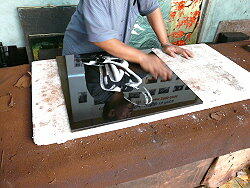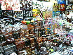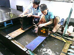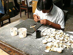1時間あまりでホーチミン市に到着し、最初に案内されたのは漆塗りの販売店である。ここでは実際に螺鈿作りの制 作現場を直接見学出来るようになっていた。店から水二本が無料提供され、皆さんここでお金を大いに落として下さいと いう感じであった。