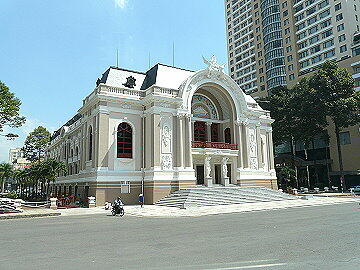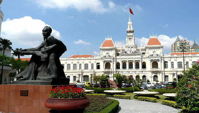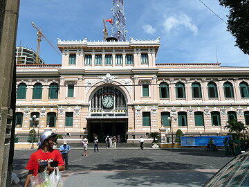 ホーチミン人民委員会庁舎。聖マリア教会とならび、フランスの植民地時代を代表する建物。1901〜1908年にかけて 建てられた。フランス領時代にコーチシナ政庁庁舎として建てられ、その後、南ベトナム時代は国会議事堂として使われ ていた。現在、ここは観光スポットとなっていて、多数の観光客が見物していた。建物の前にはホー・チ・ミンの像があ る。