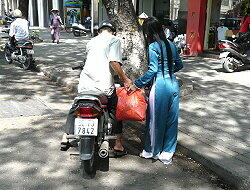 アオザイの女性が呼び込みをしていました サイゴン川に遊覧船が停泊中