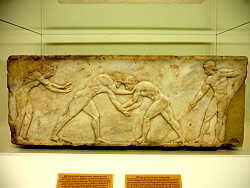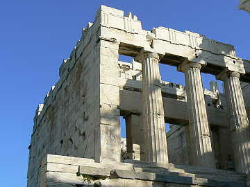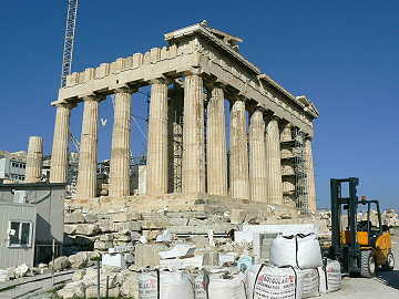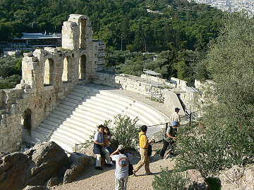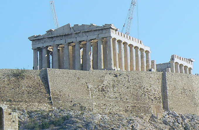 今日はアテネ半日観光と言うことで9時過ぎにバスが本船に迎えに来て、アテネへ向け出発する。最初はギリシャのシ ンボルとして有名なパルテノン神殿が建つアクロポリスの丘へ向かう。神殿は100メートル以上もある丘の上にあり、 あの丘の頂上まで歩くのかと思うと気が滅入ってしまうが、目の前の神殿を見ると是非、近くで見たいという気持ちの方 が勝って、滑りやすい大理石の階段を登り始めた。
