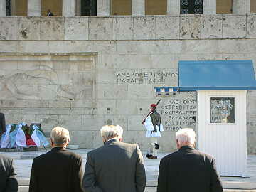 帰り道はアテネ市内を車窓から見て回り、途中、古代オリンピック競技場に似せたパナティナイコ・スタジアムや大統 領府の衛兵などを下車して写真撮影。13時過ぎには本船が停泊している一番奥まったBポートに到着し乗船。本船に 乗船してからよく考えてみるといつも記念に観光した場所のマグネットを購入しているのだが、今回は観光中に購入する 暇がなかったのが心残りであった。