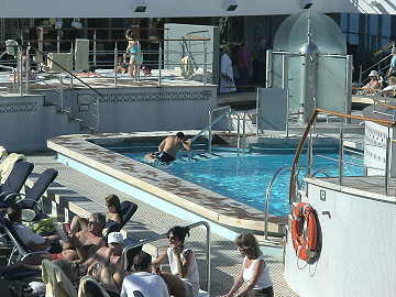 今日は久しぶりにゆったりとした一日を過ごす。今までの観光の疲れを取るつもりで何もしないで、一日中ブラブラして いた。今日の天気は快晴でイタリアに近づくと次第に気温も上がり、プールサイドでは皆さん水着に着替えて甲羅干しの 真っ最中であった。さすがにプールで泳いでいる人はほとんどいないが、それでも二人ほど泳いでいた。しかし、すぐプ ールから上がってジャグジーへ直行していた。