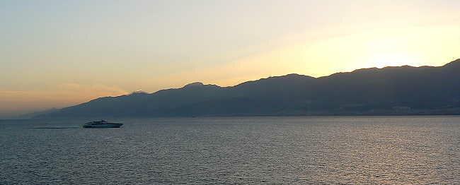 17時頃、長声一発の汽笛を鳴らし、シシリー島とイタリア本土の海峡にさしかかる。この海峡は往路ではよく見なかっ たが、復路では日没と重なりきれいな街並みを見ることができた。このくらいの距離であれば橋かトンネルを作れば簡 単に本土と島を行き来できるのになぜ工事をしないのか、ちょっと疑問である。