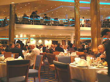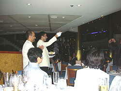 写真を取ってからそのままディナーに出かける。今日は3回目のフォーマルである。食事を終了したとき、恒例のシェ フ達の紹介、ウェイター達の「蛍の光」の大合唱で大いに盛り上がった。今回のクルーズもいよいよ大詰めにきたという 感じである。明日は最後の寄港地ナポリに到着する。