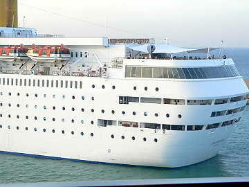 停泊している本船の脇を「コスタ・ロマンチカ」が静かに通り過ぎていった