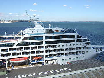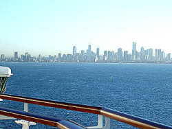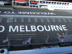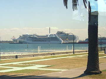 朝5時にはポート・フィリップ湾内に入り街の灯が見えるようになり、本船は定刻通り、9時に埠頭に接岸した。向かい 側にはタスマニアへ行くフェリーと本船より後から到着した、本船と同じ会社のパシフィック・プリンセスが停泊してい た。この船は30日間かけてオーストラリアを一周しているクルーズ船で2日後にはシドニーへ戻るという。