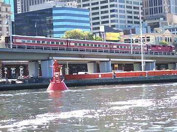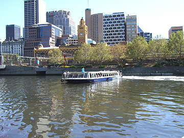 ヤラ川を上下する観光船 黄色い建物はフリンダース・ストリート駅