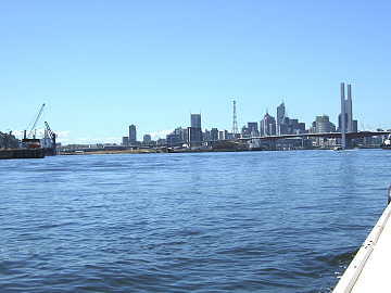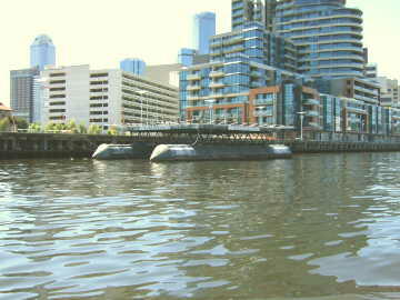 ヤラ川を下って港から市街地を見る 川のあちこちにヘリポートがありました