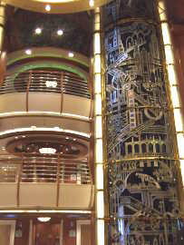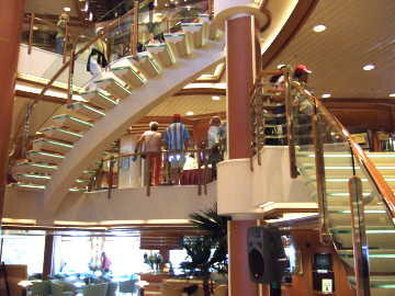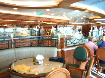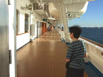 しかし、細かいところの造作はさすが日本製と思われる箇所があるのは救いであるが、いただけないのはプロムナー ドデッキが板張りでなく、色を塗ってそれらしく見せているのは経費節減の結果なのだろう。このような甲板は今まで見た ことがない。よく観察したらスポーツデッキとプールがあるサンデッキのみ板張りであった。