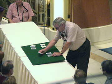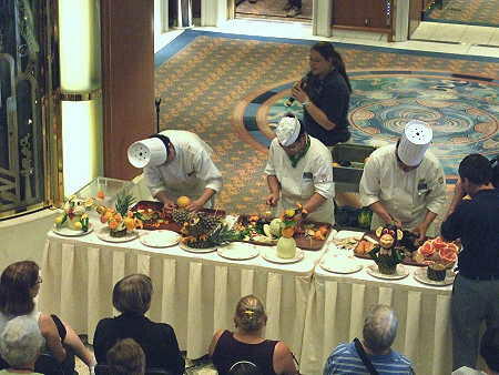 13:00頃にはMoliary Pointを通過する。波は穏やかで快調な航海が続いている。気温は少し肌寒い17度であるが、 それでもプールで泳いでいる人がいるのには驚きである。終日航海日なので船内の催し物が盛りだくさん実施されてい る。定番の野菜と果物の彫刻ショー、ラインダンス教室、カクテルマティニーの作り方、男性ゴルフ飛距離大会、テーブ ルマジック、サイコロで進む木馬レースなど目白押しである。