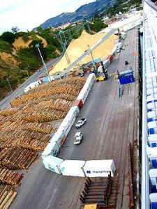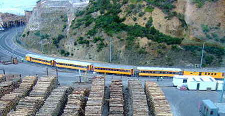 本船はポートチャーマース港の貨物専用埠頭に接岸。近くには木材、チップヤードがあり、本船は狭い貨物用埠頭 にその場回転してようやく接岸した。セキュリティ上から本船近くにぐるりとコンテナを並べて外部とシャットダウンするよ うにしていた。埠頭のそばにはポートチャーマースとダニーデンを結ぶ、まるでHOゲージから出てきたようなクラシック な臨時の列車が運行されていた。クルーズ船が入港すると運行されるらしい。