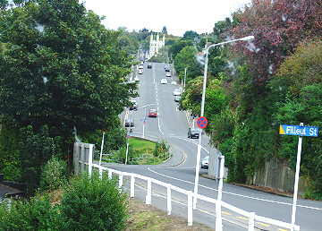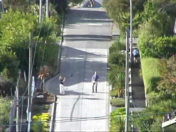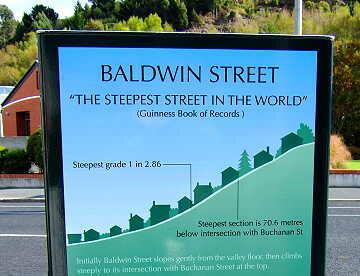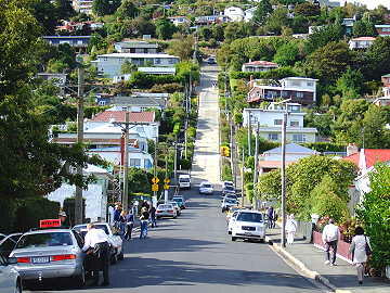 ダニーデン北端にはギネスブック公認の「世界一急な坂道」があります(ボールドウィン・ストリート)。この坂は人が住 んでいるストリートの中で最も急な坂だと言うことです。毎年この坂を往復する競技大会があり、現在の記録保持者が女 子大生ということを聞いてビックリ。