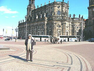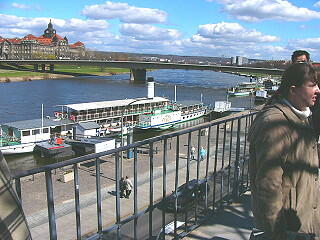 エルベ川のフィレンツェといわれるドレスデン。昨年は大洪水に見舞われ今年は大干ばつで 川の水位も下がりつつあるという。現地ガイド(左写真)「ブリュールのテラス」にて。