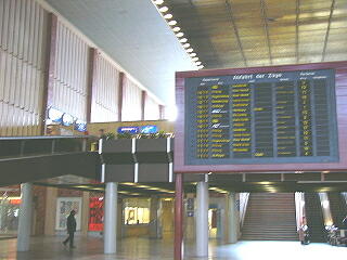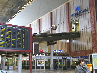 正面に時刻表。ホームへには歩く歩道で左から右側の壁の中に入る。