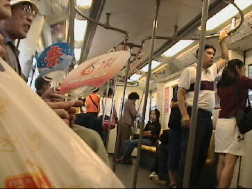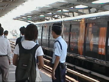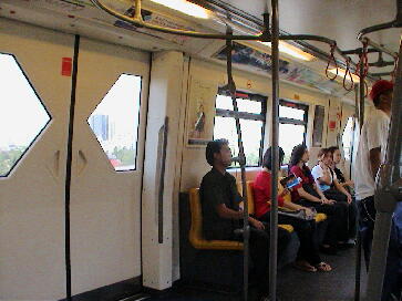 内部の様子。つり革のレールが面白い。各駅にはキヨスク?が必ずあります。