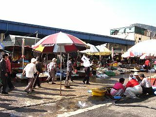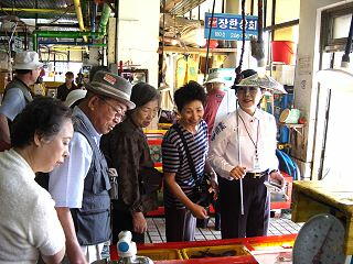 市場ビル内の小売店。珍しい魚にピックリ 韓国の物売りは皆しゃがんで売るようだ。