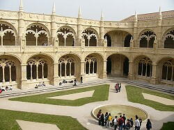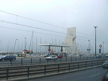 発見のモニュメント。先頭にいるのはエンリケ航海王子 道路の真ん中を鉄道が走っておりUターンするには相当な回り道をしなければならない。