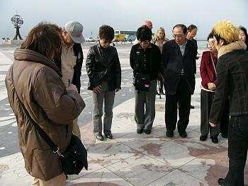 世界地図のモザイクの説明を現地ガイドから受けている。日本は豊後に漂着した年を記している。