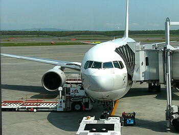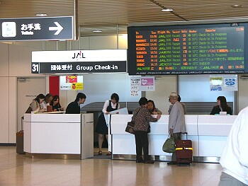 千歳のカウンターで受け付けをする いつものJL便で成田へ向かう