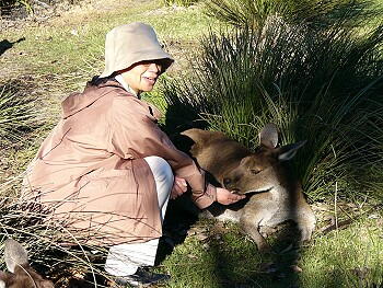左隅に突然変異の白色のカンガルーがいる 口元まで持って行かないと食べない横着なカンガルー