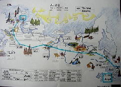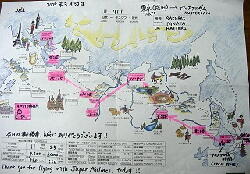 洗面所に貼ってあったエンルートの地図をCAに頼んで、行き(左)帰り(中)分をもらいました。決して黙って剥がししてきたわけでありません。以前、yasueさんのページで話題になったミルニー炭坑跡?(インターネットで調べるとダイヤモンド鉱と書いてある。どちらが正しいのかな)(右)もしっかりと載っていました。残念ながら行きは曇り、帰りは寝ていて見ることはできませんでした。