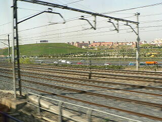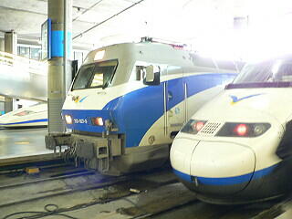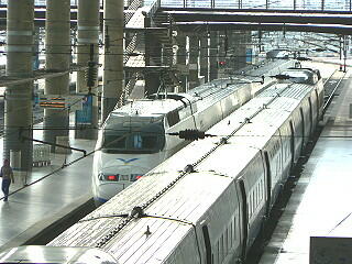 フランスTGVの技術を採用したAVEは、列車の両端に電気機関車を連結しその間に連節構造の客車をはさむ方式です。従って乗客の乗る車両にはモーターはなく、台車が2両分の接合部の下に1台付いているという構造。日本の新幹線に比べて車内は静かで滑るような乗り心地ですが、スピードを上げると風切り音が大きい感じでした。