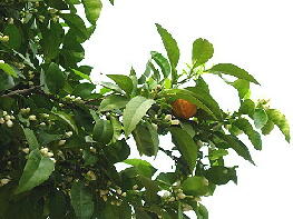 花と実が同時に見られるオレンジの木 壁だけが残っている建物