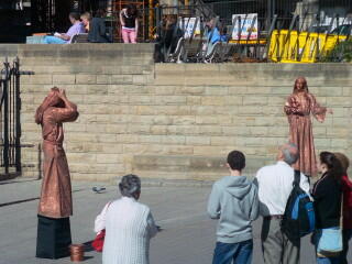 教会の横でこのような大道芸人が立っておりました。さしずめキリストとマリア様というところか