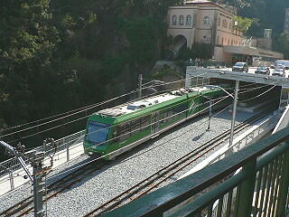 枕木の並べ方がが面白い 奥にケーブルカー、手前は登山電車