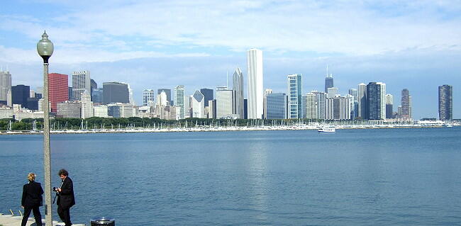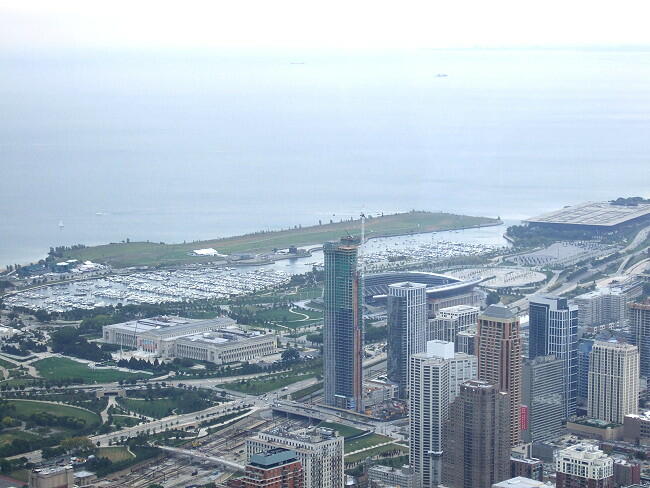 オヘア空港から市内まで20分あまりで到着。最初に水族館、プラネタリウム、ソルジャー・フィールドが集まるノーザリ島へ渡る公園で下車し、ミシガン湖畔やシカゴ市内のビル群を見物する。