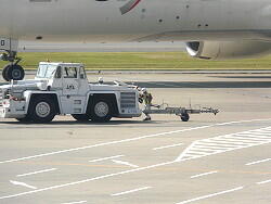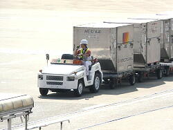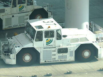 ホテルの真下に駐車しているトーイングトラクター ANAのオペレーションセンターに向かう乗務員